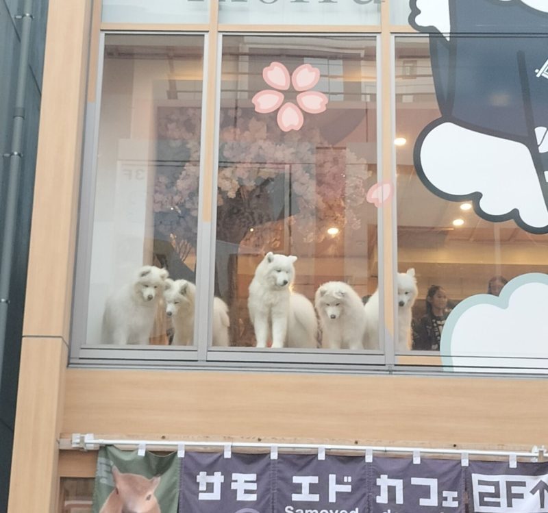 サモエドカフェのワンコ達が、窓辺にたくさんいました🦴