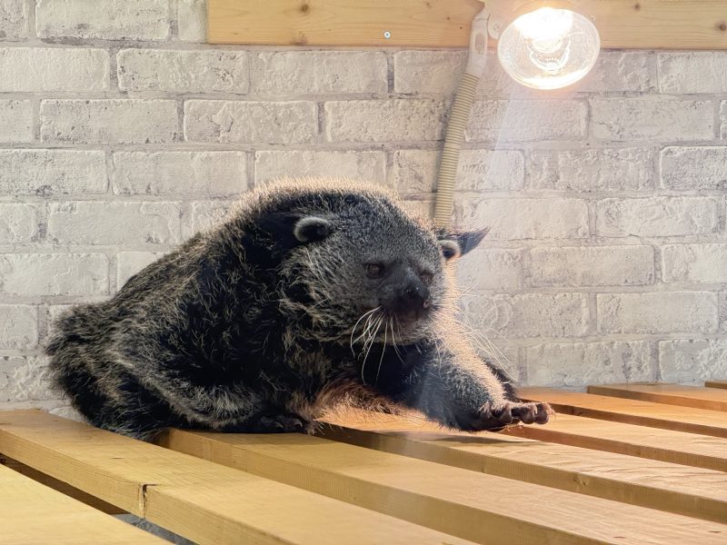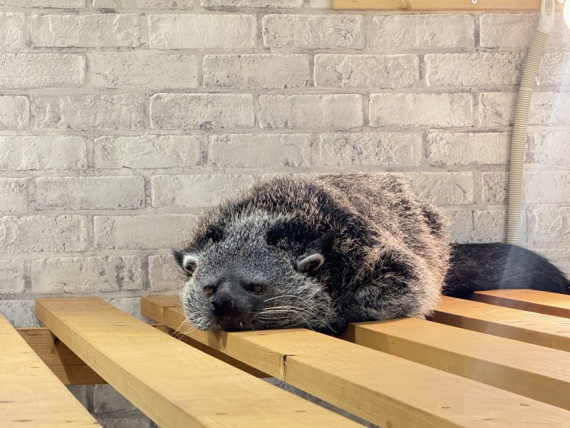 こんにちは川島です。室内動物園最後の紹介はビントロングちゃんです!ジャコウネコ科の動物で体臭がポップコーンのような香ばしい匂いがします!ここには二匹いたのですが距離があったもののほんのりポップコーン感じました💖